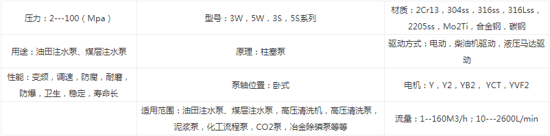 適用范圍: 油田及礦場(chǎng)注水泵、超高壓泵、噴射泵,除鱗泵、高壓清洗泵,加濕泵,噴霧泵,流程泵、稠漿泵、泥漿泵、液態(tài)二氧化碳泵、洗滌劑料漿泵、化工泵、液壓泵、輸油泵,海水泵等專業(yè)用泵。 特 點(diǎn): 該泵吸收國(guó)內(nèi)泵業(yè)之精華,設(shè)計(jì)先進(jìn)、結(jié)構(gòu)緊湊、體積小、泵效高、運(yùn)行平穩(wěn)、安全可靠、操作簡(jiǎn)便、產(chǎn)品制作精良、外形美觀。每個(gè)品種的泵都有安全調(diào)壓閥,泵壓可以任意調(diào)節(jié),并有油溫、壓力、自動(dòng)保護(hù)。 結(jié)構(gòu)型式:固定式、移動(dòng)式 泵體結(jié)構(gòu):臥式、立式 傳動(dòng)型式:電機(jī)或柴油機(jī),變速型式:皮帶、齒輪、電磁調(diào)速、變頻速、 主要零部件:機(jī)座(材料HT250);泵體(材料:316、1Cr18Ni9Ti、2Cr13、 碳鋼化鍍鎳-磷合金防腐層)經(jīng)熱處理,避免疲勞破裂;曲軸(材料:35CrMo、42CrMo)經(jīng)調(diào)質(zhì)硬氮化處理、強(qiáng)度大、硬度高、耐磨耐用;柱塞(材料:超性陶瓷、噴焊鎳合金Ni60耐磨耐腐層);盤根密封(采用進(jìn)口芳綸或碳素纖維)。 閥組型式:錐閥、平板閥、組合閥等。經(jīng)特殊處理,耐磨耐用。